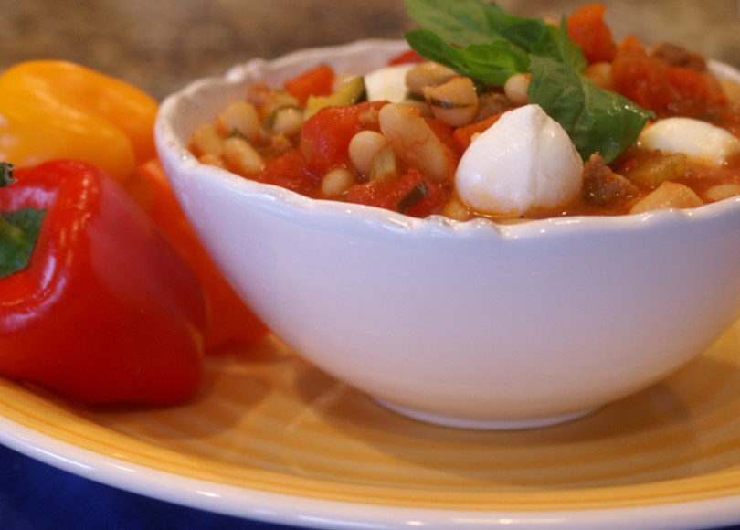 Every Halloween, we have a big party for the kids and a chili cook-off for the adults, at our church.  Naturally I enjoy the competition, who wouldn’t right?  This takes me into my food “lab” where I come up with new chili recipes.  In fact, after we returned from Hawaii one year, I created “Maui Chili” with pineapple, pork and white beans.  Then one year, I concocted “Tuscan Chili” with typical Italian ingredients, including little mozzarella balls-yum!  Another year, I created a “Mexican Chili” using chorizo, fresh tomatillos and Mexican cheese.  They were all a hit and I actually won a couple of times too.  I even entered the Tuscan Chili in a cooking contest-although I didn’t win, I love this photo, which my dear friend Debbie took for me.  I thought, with a photo this nice, I would win for sure-not true unfortunately.  So now you get to enjoy the recipe and the photo too!