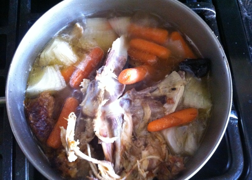 Put the chicken carcass (what a funny word) in a large pot. Throw in some carrots, celery, onions, fresh parsley and garlic cloves for flavoring. Cover chicken bones with water and a lid, slightly open to allow steam to get out. Turn this mixture on medium-low and cook for as many hours as you can spare. The longer you cook it, the more rich and delicious your broth will turn out. After say 6-9 hours, simple drain into a bowl through a sieve. Refrigerate the broth over night. In the morning, scrape off the fat that has collected on the top. This makes your broth pretty much fat free too, which is an added bonus.