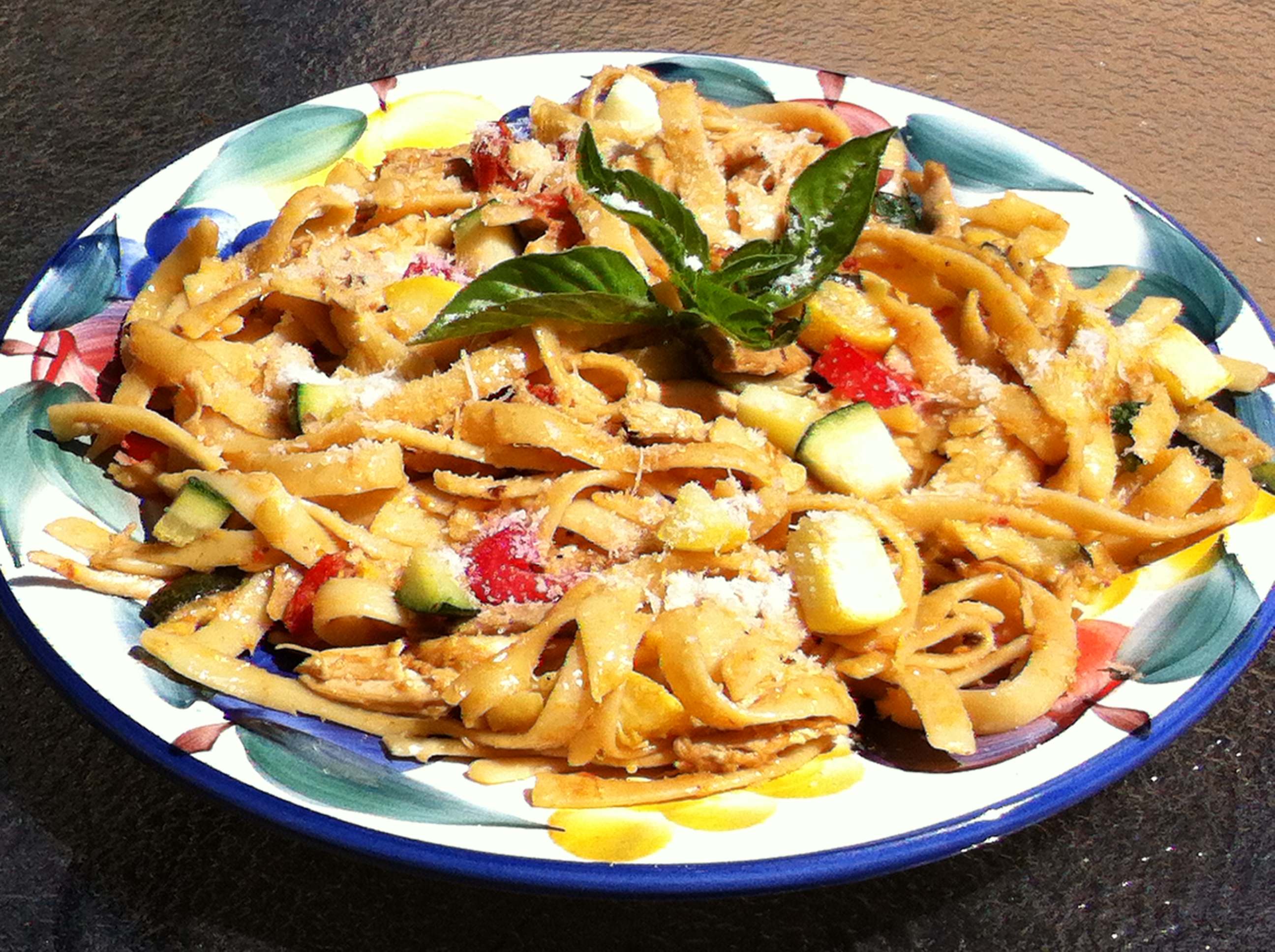 Finally I made a pasta dish that just kind of came together based on what I had on hand. It included homemade sun-dried tomatoes, roasted chicken, shallots, garlic, zucchini, yellow squash and of course, parmesan. Yum! Recipes are below…enjoy making your own Italian Feast!