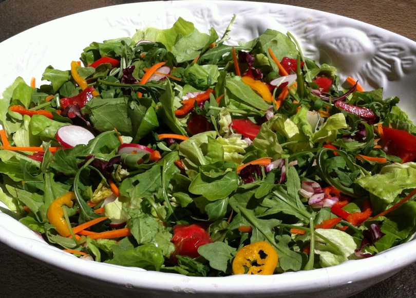 Last night we had some friends from Portland over for dinner. I’ve been wanting to make an Italian Feast for some time now, but just hadn’t had the opportunity. With company coming, it was perfect. Our first course was “Ensalada Mista” which includes bibb lettuce, arugula, radicchio, shredded carrots and tomatoes (the authentic version). I also added green onions, radishes and avocado, just for fun. We served it just like the Italians do, drizzled with olive oil and balsamic vinegar.