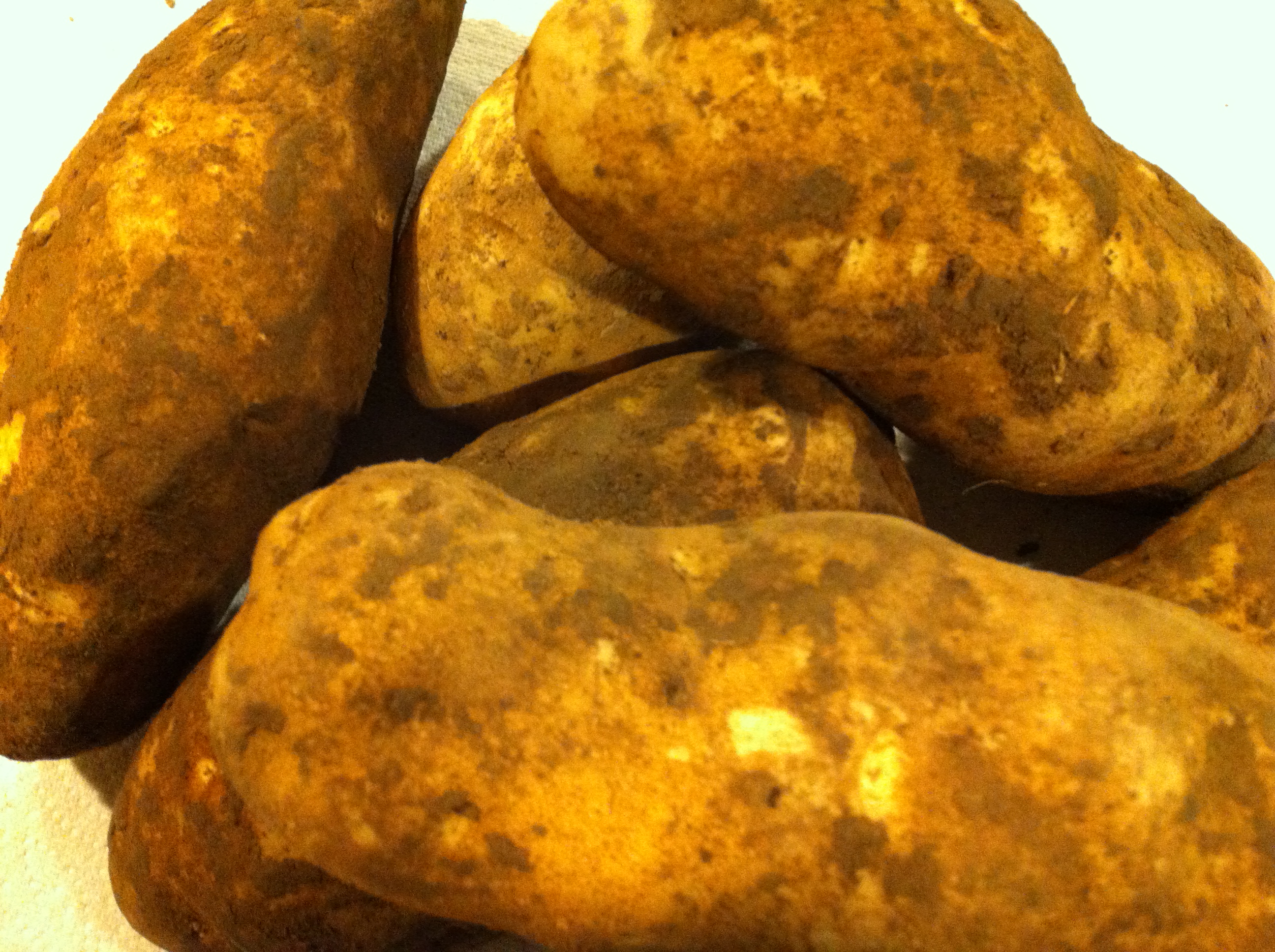 So tonight, my friend Diane stopped by on her way home from Idaho to California.  She brought me some very fresh potatoes that she had just picked (oops I mean “dug up”) that morning…Anyway, these babies were fresh.  I had to wash real dirt off the skin and when they baked, they were soft and slightly sweet.  In fact they were so good that I’m not sure if I will be able to go back to store-bought!  Here they are…