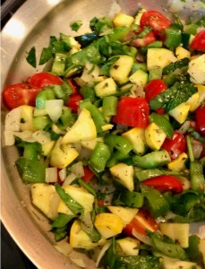 Add oil to pan and warm over medium heat. Beginning with the pepper and onion, sauté while stirring for 2 minutes. Add the squash and stir/sauté for another 3 minutes. Throw in the spinach, fresh basil and tomatoes. Continue to cook for another 2 minutes.