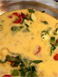 Once vegetables are soft, remove them and spray the pan with cooking spray (to ensure frittata won’t stick after baking). Put veggies back in and pour eggs over the top; combine gently.