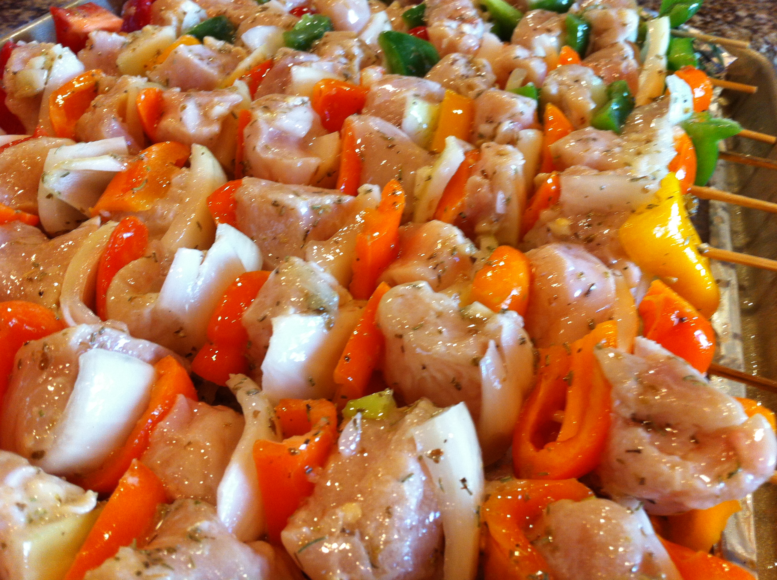 Cut chicken, red pepper (or whatever type of pepper you enjoy or have on hand) and onion into bite sized pieces. Place 1 piece of red pepper, then a piece of onion, then 3 pieces of chicken on a skewer. Or you can do every other like I did in this photo (above) – not necessary…I just wanted a pretty photo! Repeat this order until skewer is filled, ending with the onion and pepper. Mix remaining ingredients with whisk and either pour over kebabs or brush on both sides. Marinate for 1-2 hours. Before grilling, salt and pepper to taste. Grill until chicken is cooked through and vegetables are tender.