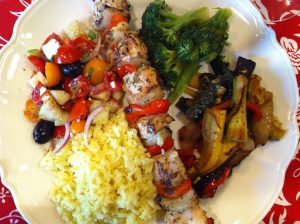 For my Greek Feast, I made Chicken Kebabs and Lemon Rice (recipes below), Greek Salad, creamy Tzatziki and Roasted Vegetables (recipes linked) . I must say this feast of delicious food took us right back to our wonderful memories of Hungary. You’ll need plenty of lemons, fresh garlic and herbs to make this meal so be prepared!