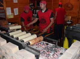 The next photo shows kürtöskalács (or chimney cakes) a traditional sweet bread cooked over hot coals and covered in sugar, which was tasty!