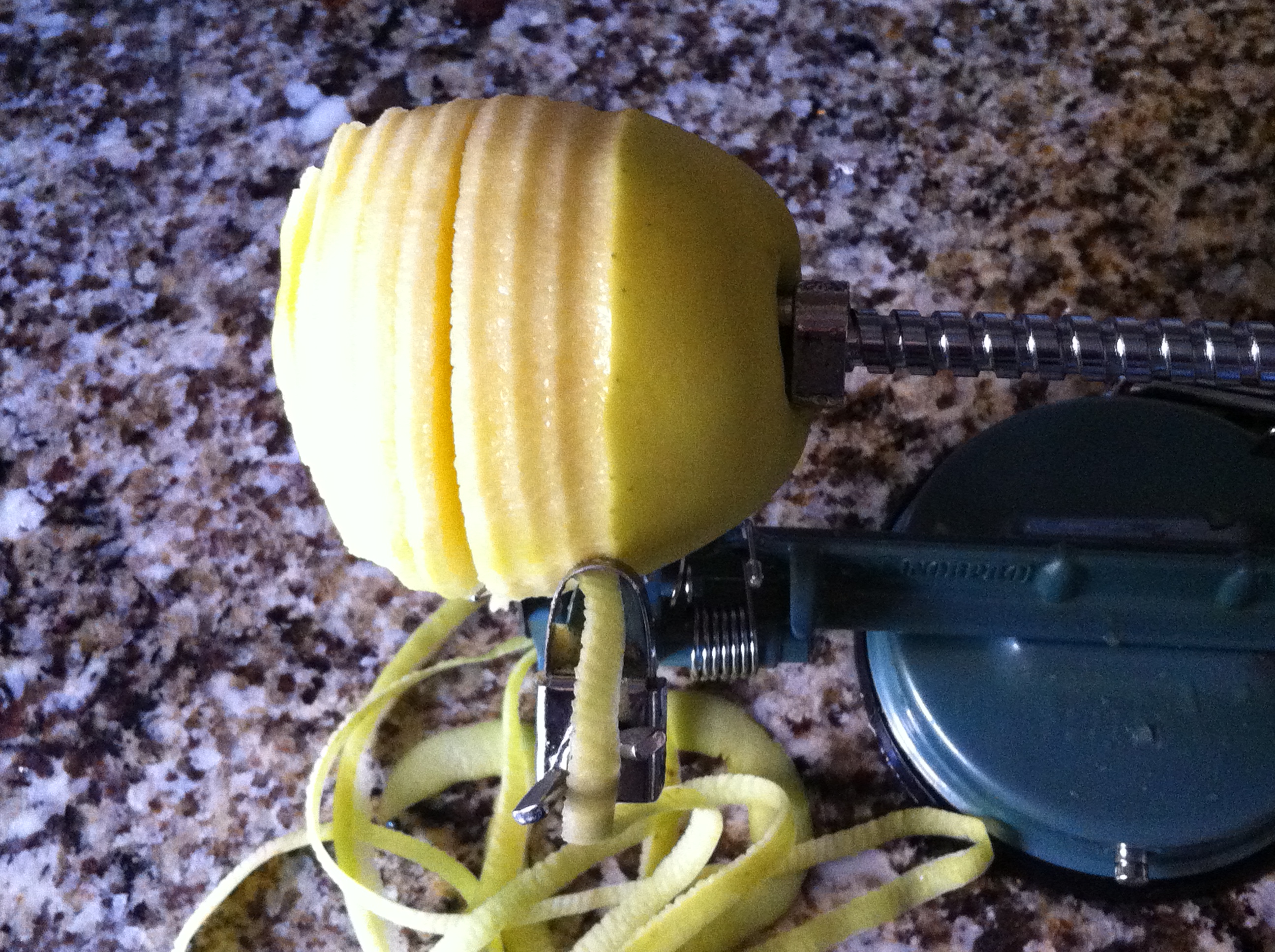 *I use my handy dandy apple peeler, corer slicer contraption to prepare the apples. It is seriously amazing. You must have one. I got mine at Ross for $13.99 but they are available all over the internet. The great thing about using this tool is the slices come out just the right width to ensure the apples cook properly. Any thicker and your crust is overdone with hard apples. Take my word for it, this is a must-have tool. My kids and grandkids love to watch and eat the freshly peeled apple slices.