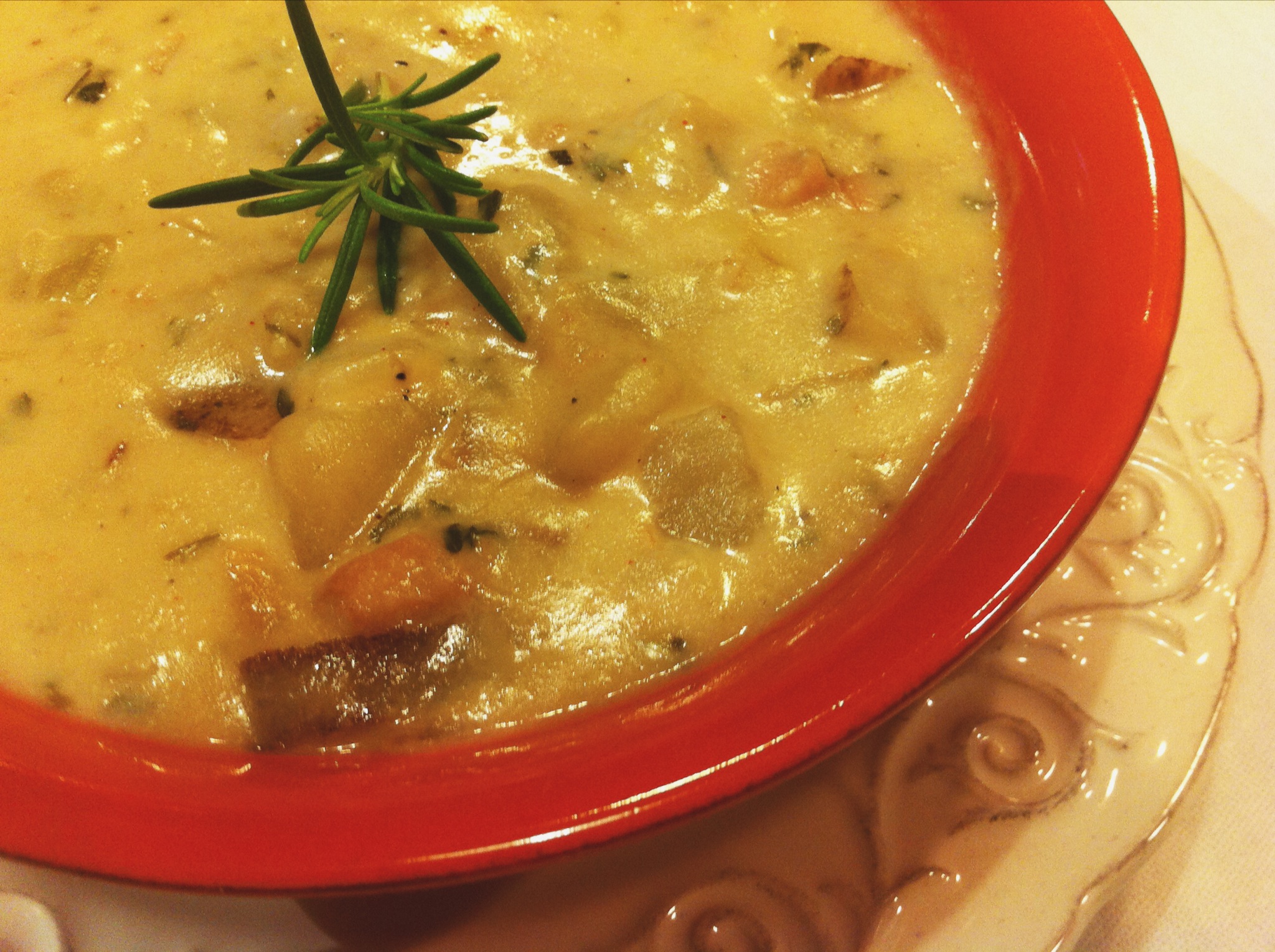 What we didn’t anticipate was just how warm, thick and delicious this clam chowder would be.  Full of the normal chowder ingredients, celery, onions, potatoes and clams, this recipe went one step further by adding…fresh rosemary, and lots of it. Yum!  We enjoyed it so much, that we went back the next day and ordered more for take-out.