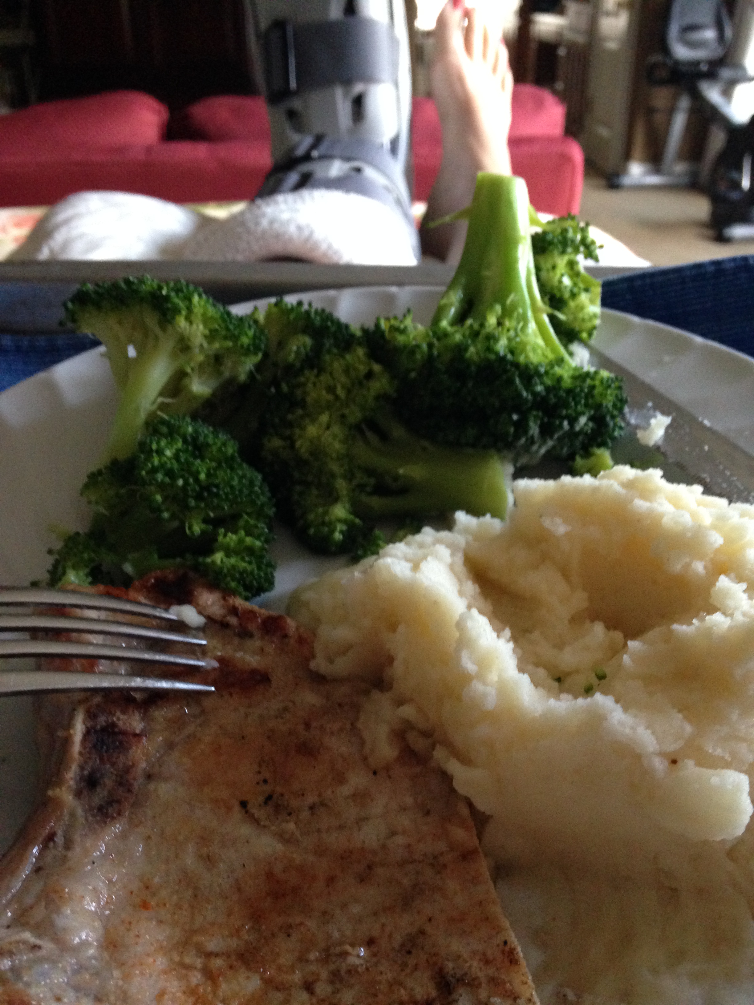 Grilled pork chop, mashed potatoes and broccoli