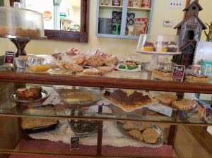 A quaint, down home restaurant it was decorated with old fashioned, you guessed it, aprons, lace curtains, vintage photos, bird houses and painted signs.  But the best part of the décor was the display case of tempting desserts!