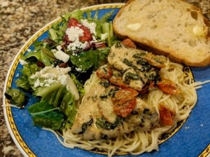 In a large skillet add olive oil, brown chicken on medium high heat for 3-5 minutes each side. Remove chicken, set aside. Add heavy cream, chicken broth, Garlic & Tuscan seasoning, balsamic and parmesan cheese. Whisk over medium high heat until the sauce starts to thicken. Add spinach and tomatoes. Add the chicken back to the pan, warm through and serve over pasta (if desired). Salt and pepper to taste.