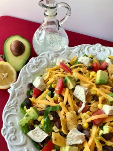 Top lettuce with the cilantro/black bean/corn mixture, tomatoes, avocados and chicken.