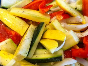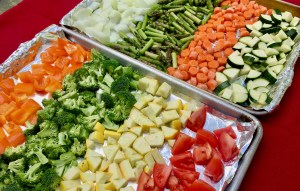 Place a piece of aluminum foil on a jelly roll pan or cookie sheet. Mist with olive, avocado or coconut cooking spray. Choose a good variety of vegetables in season. Clean and cut them in uniform sizes. Place on the prepared pan and drizzle with olive or avocado oil. Sprinkle with salt and pepper. Bake in a 400º oven for 20-30 minutes or until desired consistency is reached. Use in recipes or serve as a side dish and enjoy!