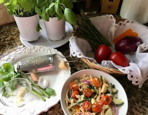 While pasta is cooking, pour 3 T olive oil into a large skillet set to medium heat. When pan is warm, add the chopped garlic and onion. Stir and cook for 1 minute; add broccoli, asparagus and red pepper. Stir and cook for 2 minutes. Add yellow squash, zucchini and Herbs de Provence; stir and cook for another 3 minutes or until all vegetables are tender but not mushy. The color will be more vibrant if you don’t over-cook them.