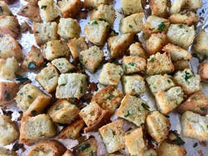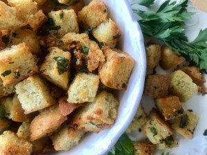 Here’s my quick version as inspired by Ina: cut 4 slices of bread into 1/2″ squares. Place 1 T of olive oil and 1 T of butter in a frying pan on medium heat. Once melted, add the bread squares and sprinkled with salt, pepper, garlic granules, and parsley flakes. Then sauté until the bread is slightly brown and crunchy…so easy and tastes great!