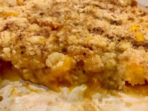 Bake at 350º for 30-35 minutes or until peaches are bubbling and crumble is cooked through. Remove from oven; cool for 10-15 minutes; serve with vanilla ice cream, whipped cream or warm custard!