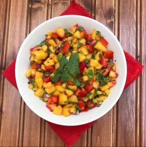 Delicious, ripe, sweet peaches, red pepper, jalapeño, garlic, cilantro and red onion make the best salsa ever! Serve Peach Salsa on fish or chicken, with your favorite Mexican dish, with tortilla chips or on top of cottage cheese for a nutritious snack. It’s also good eaten right out of the bowl with a spoon!
