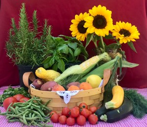 Every year, from July to October, I enjoy shopping for produce at our local farmers market, Borski Farms. In fact, here’s a picture of all the vegetables, fruit, herbs and flowers I brought home one week…beautiful corn on the cob, yellow squash, zucchini, tomatoes, green beans, apricots, red potatoes, basil, rosemary, cilantro, dill and even sunflowers!