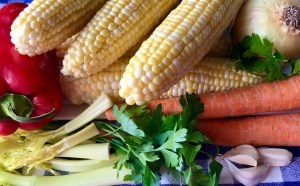 Chop onion and garlic. Clean and chop celery, carrots, and red bell pepper. Partially peel, clean and chop the red potatoes. Cut corn from the cob. Put the butter in the bottom of a soup pot on medium heat. Once melted, add the onion and garlic. Sauté for 2 minutes, then add the celery, carrots, red bell pepper and parsley and continue sautéing until on medium heat for another 3-5 minutes.. Add corn, potatoes and spices. Stir in chicken broth, bring to a boil, reduce heat and simmer for 20 minutes or until the carrots and potatoes are fork tender. Add corn starch to the half and half and whisk to combine. Pour into the soup mixture and continue to simmer and stir until thickened. Adjust seasonings to taste. Garnish with bacon bits, serve with crusty bread and enjoy!
