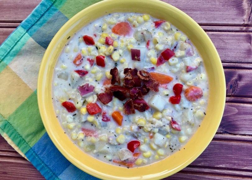 Loaded with sweet corn, red potato, carrots, celery, red bell pepper, garlic, onion, spices, chicken broth and creamy half and half, I think this Fresh Corn Chowder will hit the spot, no matter what season it is!