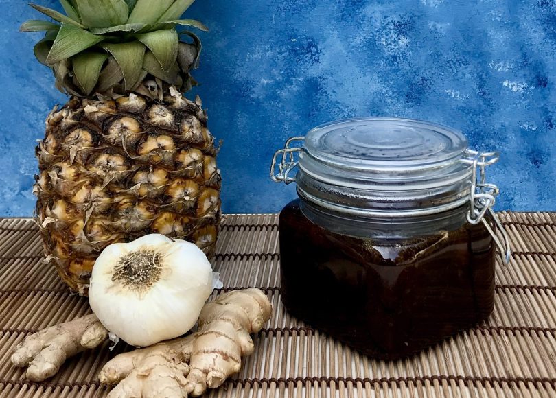 Peel and finely chop garlic clove. Peel and grate ginger root. Add sesame oil to pot set to medium heat. Sauté garlic and ginger for 30 seconds. Add soy sauce, pineapple juice, rice vinegar and brown sugar (to taste). Stir to combine and cook for about 10 minutes to meld the flavors. Mix cornstarch in the cold water until dissolved. Add to warm sauce and cook until thickened, about 10 more minutes. Serve over rice, stir-fry veggies, grilled chicken, salmon or beef and garnish with chopped green onions.