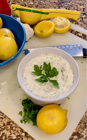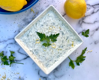 Filled with crisp cucumbers, tart lemon, flavorful garlic and savory herbs, this sauce is fresh and delicious. When I make Greek food at home, I whip up a batch to enjoy with my Greek Turkey Meat-Bowls, Chicken Kebabs, Pita bread, Lemon Rice, Roasted Vegetables. This recipe would also be good with your favorite fish or as a snack with veggies and pita chips.