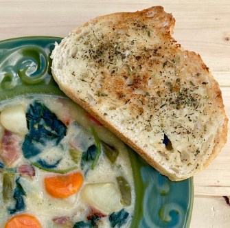 I like to get a loaf of French, rosemary or garlic artesian bread at my local grocery store. I slice the bread and place on a baking sheet. Then I spread on my favorite butter/olive oil blend and sprinkle with herbes de Provence, coarse salt and parmesan cheese. Place under the broiler until bubbling and warm. Seriously you’ve got to try this since it’s SO delicious!