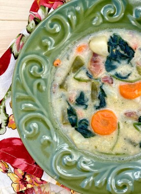 As I was contemplating what to make (a frequent pass-time), I remembered the ham hock in my freezer. Normally a ham hock wouldn’t evoke much inspiration. And then it hit me…what about a rustic soup? That’s when Country Ham & Vegetable Soup came to be. With flavorful ham, hearty vegetables and a light cream base, this soup really hits the spot!