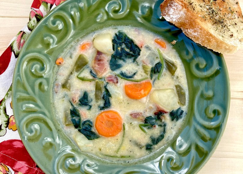 As I was contemplating what to make (a frequent pass-time), I remembered the ham hock in my freezer. Normally a ham hock wouldn’t evoke much inspiration. And then it hit me…what about a rustic soup? That’s when Country Ham & Vegetable Soup came to be. With flavorful ham, hearty vegetables and a light cream base, this soup really hits the spot!