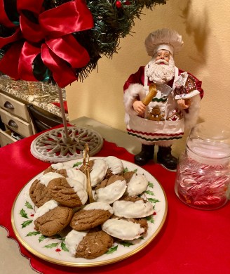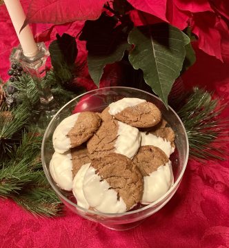 First a little history…back in 1999, my sister Suzy, discovered a ginger molasses cookie recipe in Betty Crocker’s Best Christmas Cookbook. They quickly became a favorite as Suzy included them in her huge holiday goodie platter every Christmas. She added her own touch by dipping one half of the cookie in white chocolate which makes them extra special!